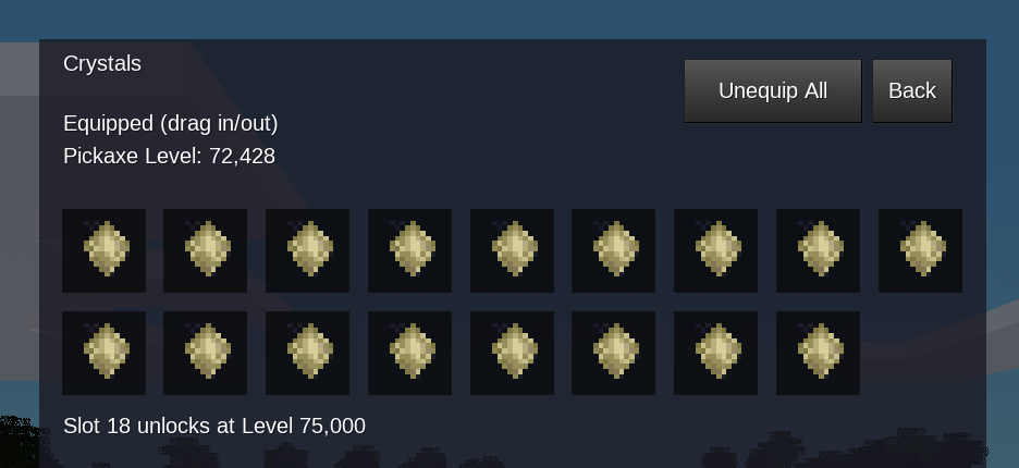 Find crystals, tier them up, and slot the best rolls on your pickaxe.